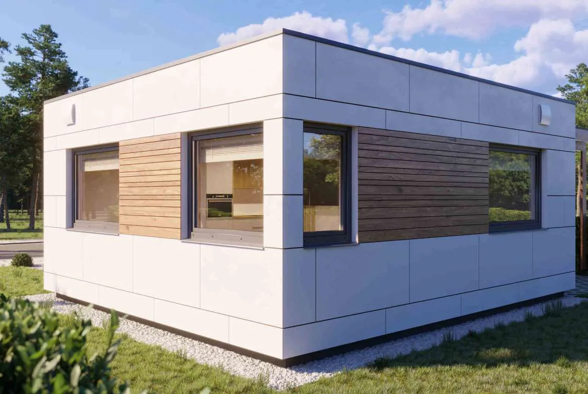 This modular house provides 32 m² of living space, with one bedroom and one bathroom. Dimensions: 6 x 6.5 m